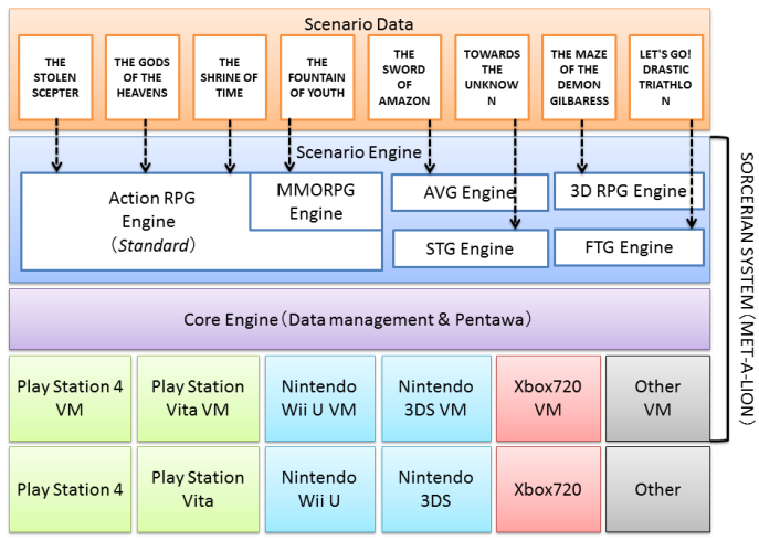 仮想マシン/コアエンジン/シナリオエンジンとレイヤー分割したことで、マルチデバイスへの同時対応を実現。また、シナリオエンジンの拡張によって、従来のARPGだけでなく、3D RPG、MMORPG、AVG、SLG、STG、FTG...シナリオ展開に無限の可能性を与える。
